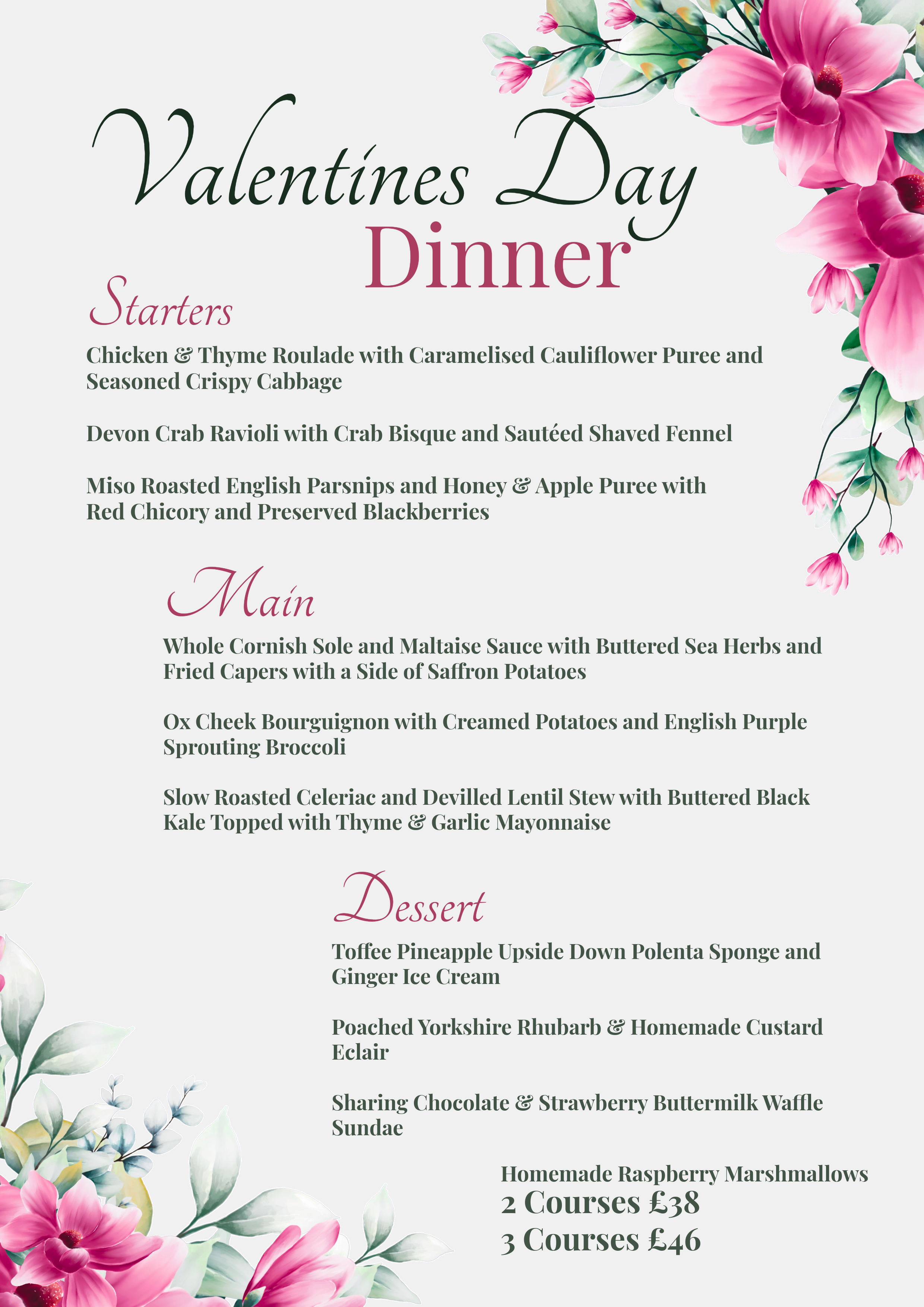We’ll be serving a sharing menu, perfect for couples, friends, or anyone who just loves good food: 2 courses for £38 | 3 courses for £46, finishing with our homemade raspberry marshmallows because everyone deserves something sweet at the end of the night.